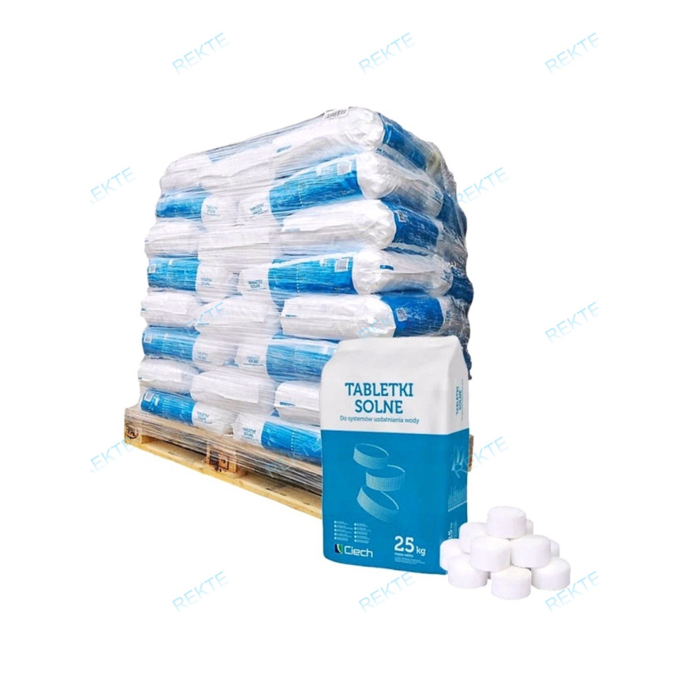 Таблетована сіль для систем очищення води Ciech Tabletki Solne 25 кг. Склад: сіль кухонна (NaCL) вищого ступеня очищення (99, 9%). Склад не містить високої концентрації інших мінералів і гарантує, що не утворюватимуться відкладення, а фільтр пом'якшення води буде захищений від забруднення. Якість продукту повністю відповідає найсуворішим вимогам виробників водоочисного обладнання. Круглі таблетки білого кольору, без солоного запаху, без ознак осаду при розчиненні у воді, розчиняються рівномірно, не розпадаючись на монокристали. Таблетки солі відповідають стандартам, що діють у Польщі. Сіль не викликає відкладення солей, що впливають на термін служби та ефективність фільтрів і пом'якшувачів, що використовуються в процесі обробки та пом'якшення. Продукт не містить механічних домішок. Має схвалення PZH та сертифікат контролю якості.NaCL - 99,10% - 99,90%