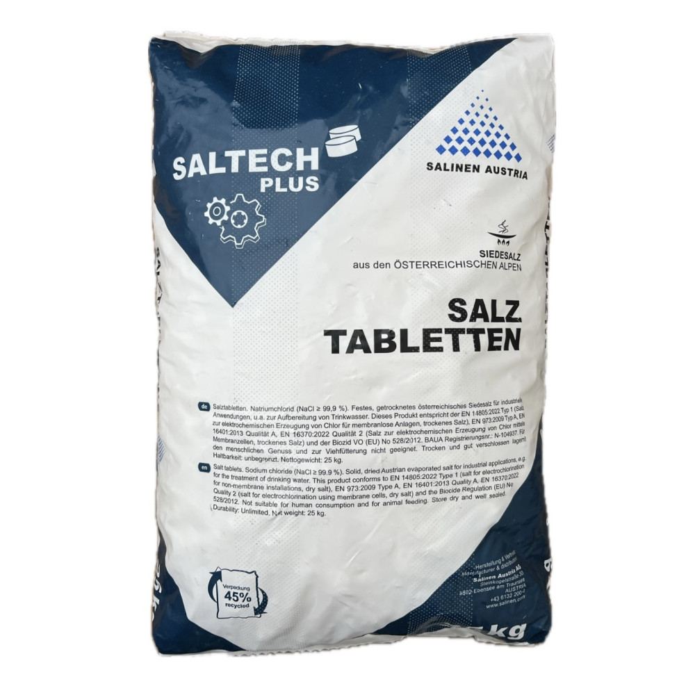 Таблетки Saltich Plus Salt виготовлені з високоякісної солі високої якості. Завдяки вмісту хлориду натрію 99,9% NaCl і низькому вмісту сульфату ці таблетки розчиняються без залишку. Таблетки солі відповідають стандартам, що діють у Австрії. Сіль не викликає відкладення солей, що впливають на термін служби та ефективність фільтрів і пом'якшувачів, що використовуються в процесі обробки та пом'якшення. Продукт не містить механічних домішок.